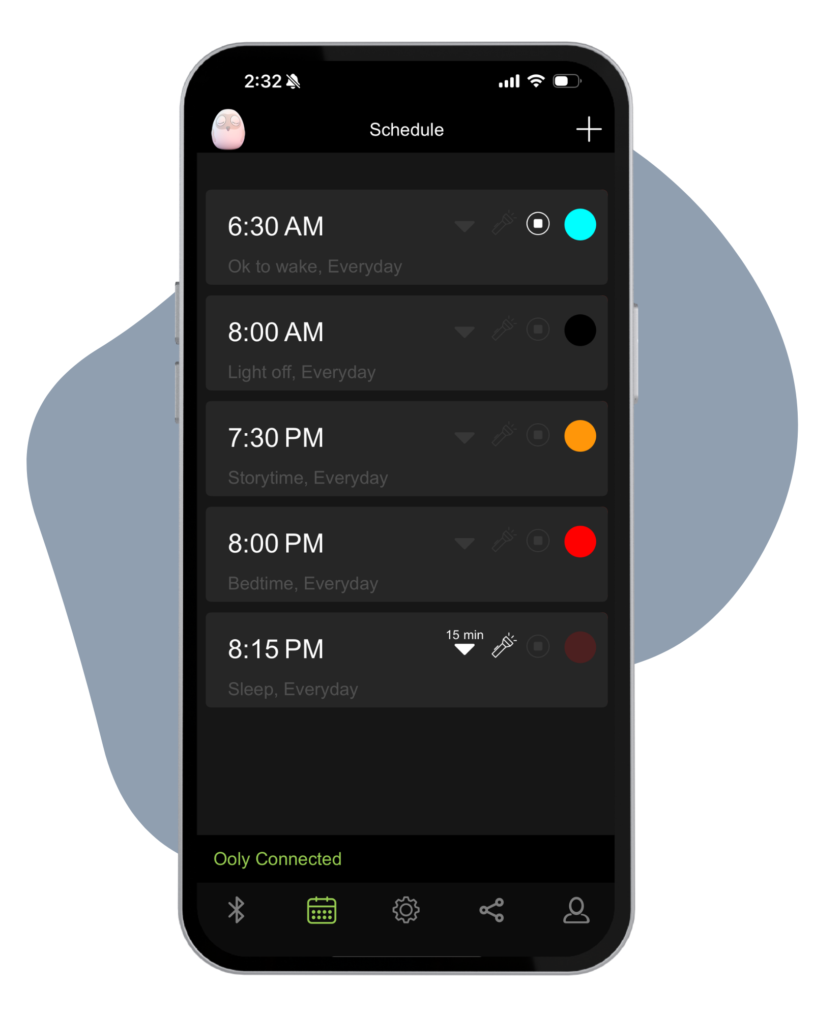 From the mobile app, set bedtime, wake-up, and nap times. Each phase will be linked to a specific color.