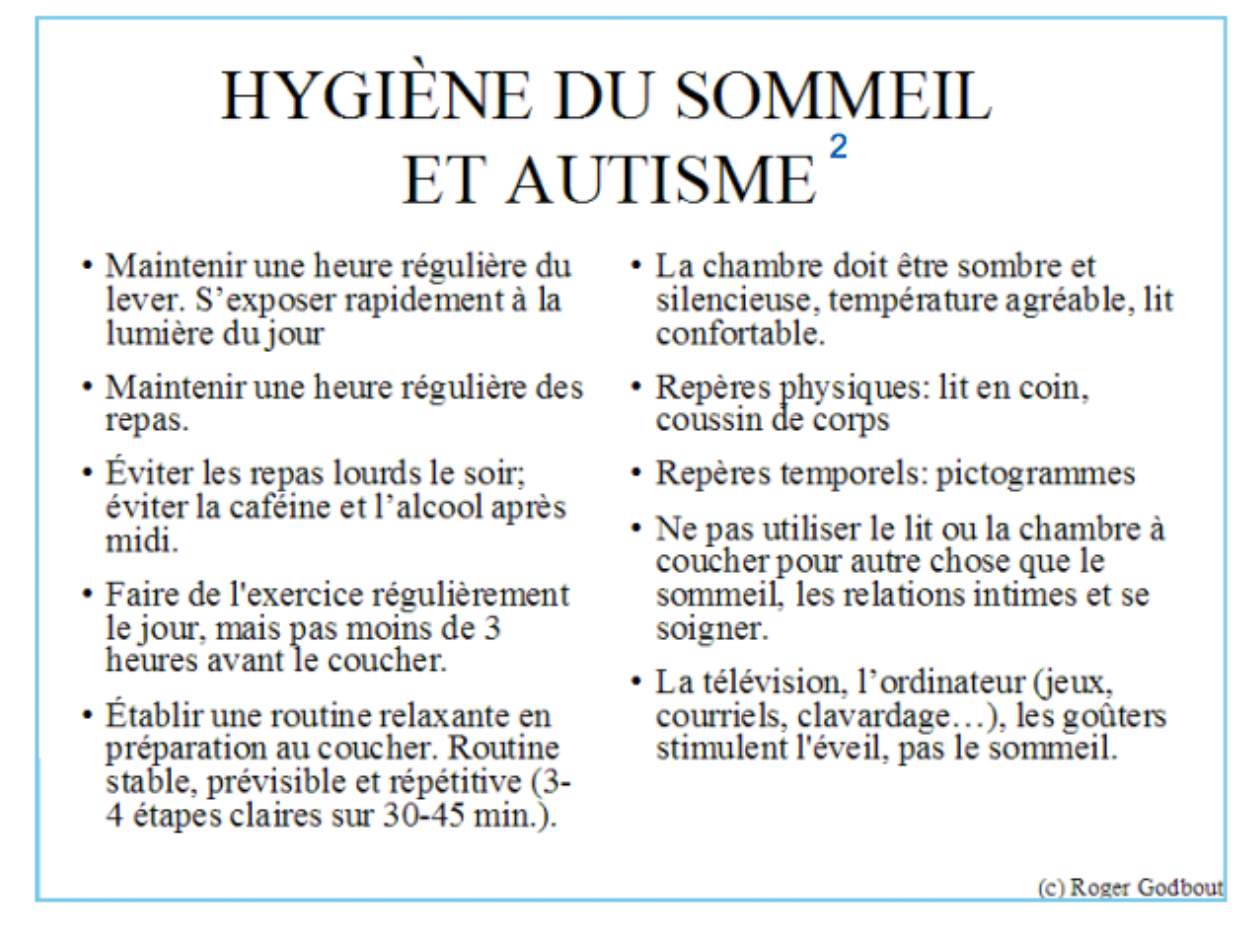 Suite à la conférence du Dr Godbout lors du dernier Rendez-vous TSA sans frontière (Laval, 20-21 octobre 2016), nous aimerions présenter quelques outils et conseils pour vous soutenir dans la gestion des troubles du sommeil des jeunes autistes.
