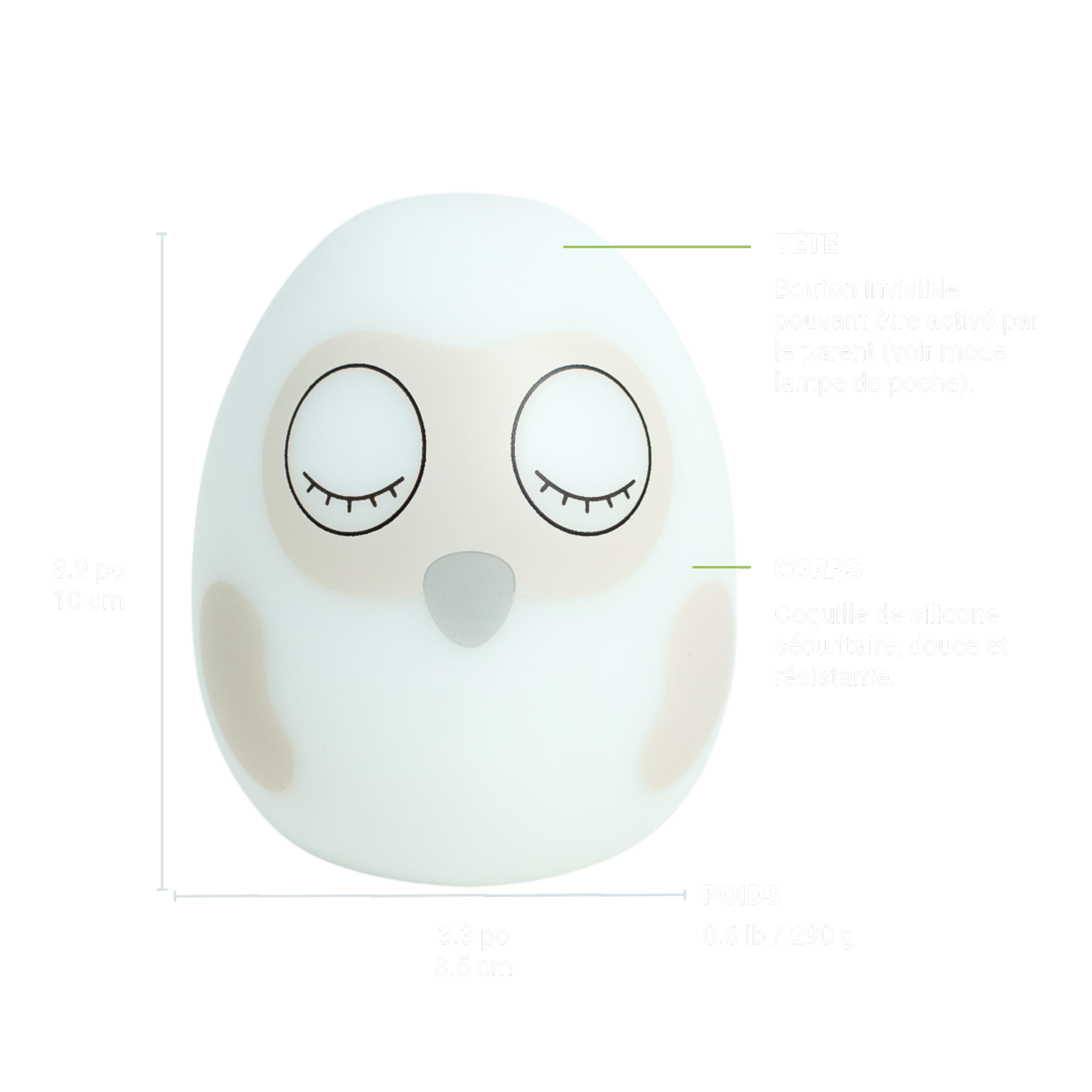 Si désiré, une légère pression sur la tête du petit hibou peut allumer temporairement une veilleuse douce. Idéal pour rassurer les enfants craintifs ou pour un aller-retour à la salle de bain en toute sécurité.