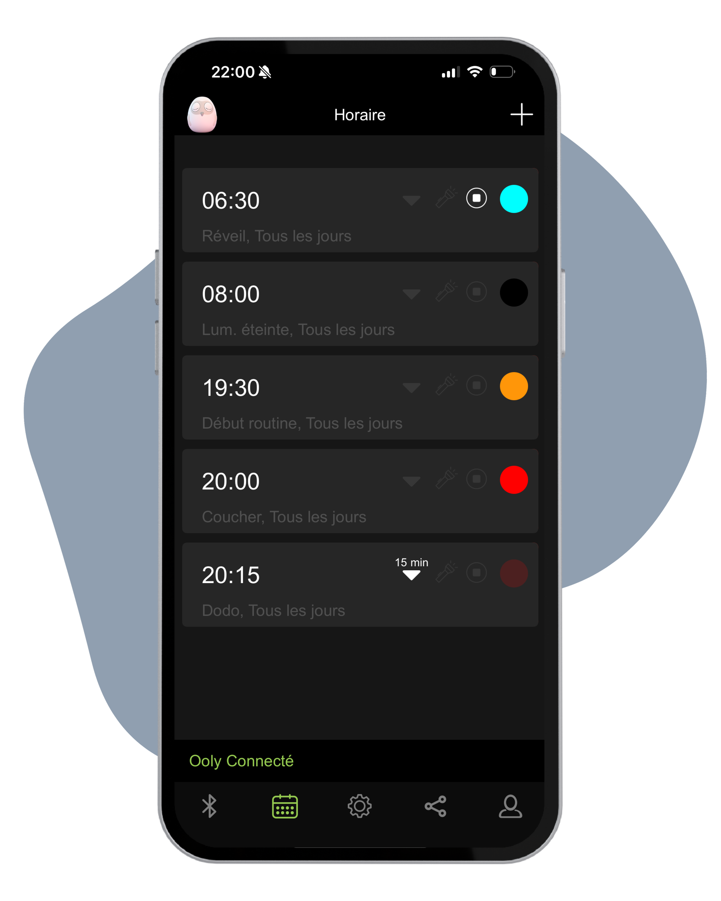 L’application vous permet de créer des horaires différents selon les jours de la semaine. Parfait pour s’adapter à l’horaire de votre famille. Vous pouvez aussi ajouter du temps de sommeil en temps réel, directement depuis votre téléphone, sans perturber la routine déjà en place.