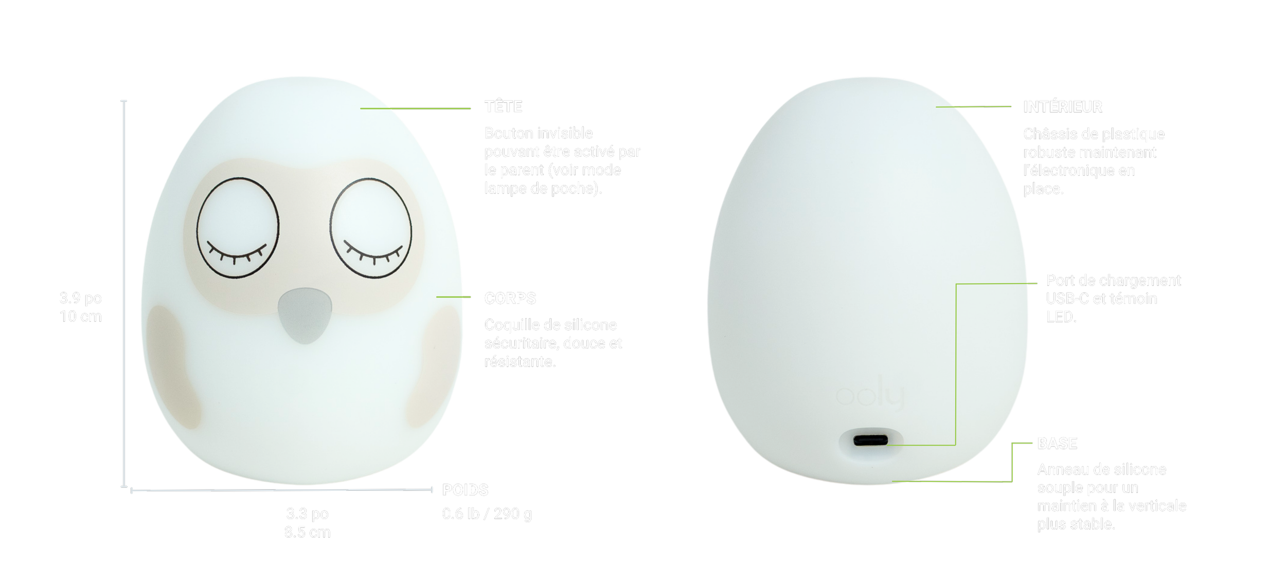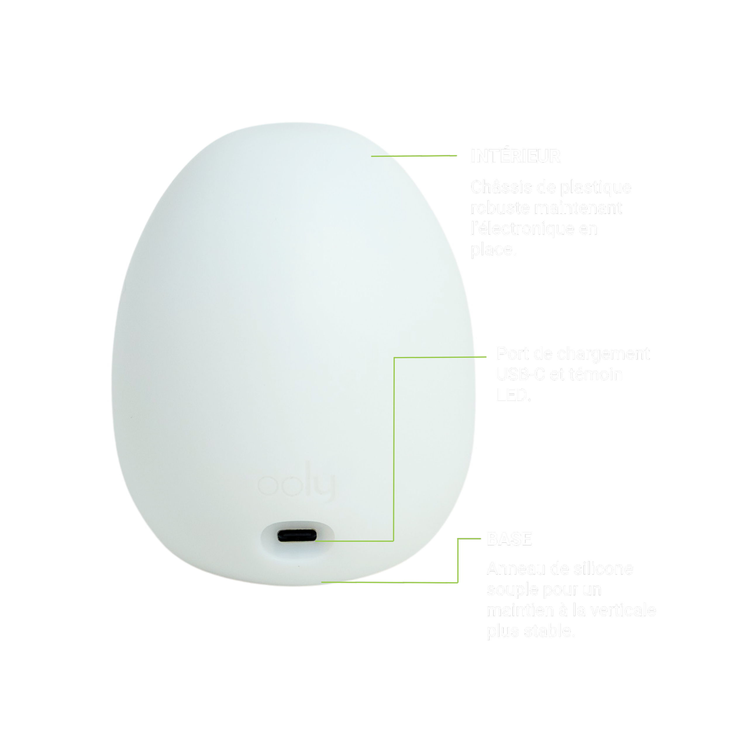 Chaque détail d’Ooly a été conçu pour être intuitif, sécuritaire et adapté aux enfants. Matériaux souples, forme compacte, fonctionnement sans fil : tout est là pour faciliter le quotidien.